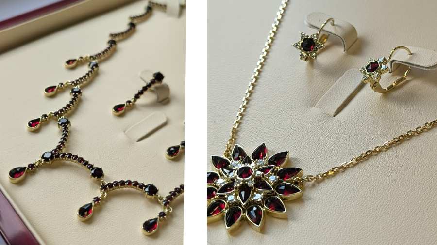 V průběhu večera, v útulných podzemních prostorách muzea, byla zhruba padesáti hostům prezentována také jedinečná zlatá šperková souprava, která vznikla v Granátu Turnov kvůli letošní výstavě EXPO 2025 v japonské Osace. Po jejím boku žádaly o pozornost také nově vytvořené zlaté soupravy šperků, a to jak jinak, nežli s českým granátem. Ten může od roku 1953 zpracovávat právě Granát Turnov, který ho také od roku 1996 těží a proto vystavuje ke svým šperkům certifikát pravosti a původu kamene.