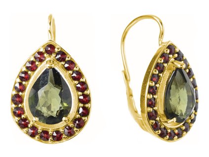 Silver earrings with czech garnet and moldavite, gold plated - drop