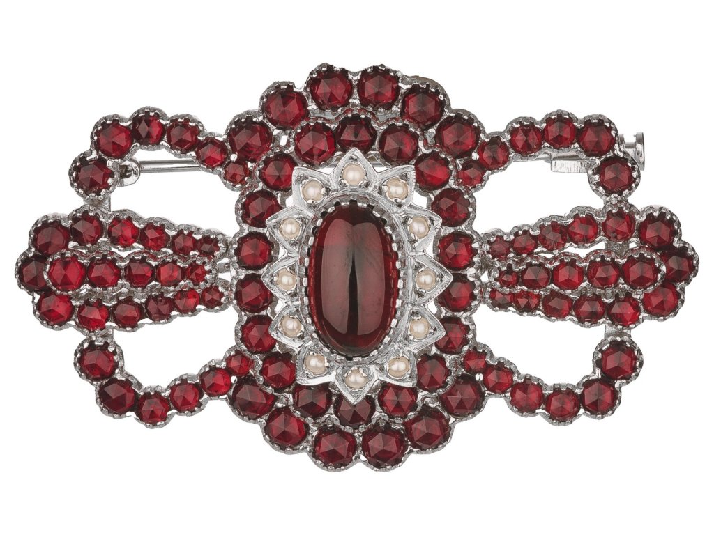 Tato stylová brož je vyrobena ze stříbra (Ag 925/1000) a zušlechtěna rhodiováním. Je zdobena českým granátem, almandinem a perlou. Velikost brože je 50x30 mm.
