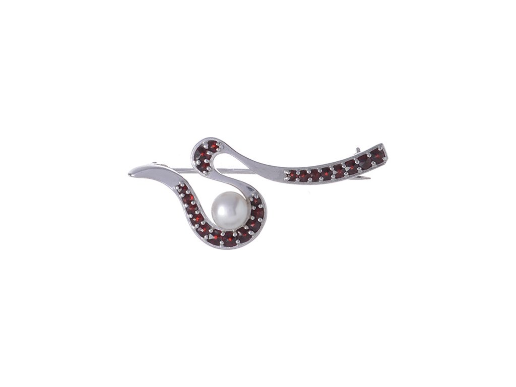 Silver brooch with czech garnet and pearl, rhodium plated - wave