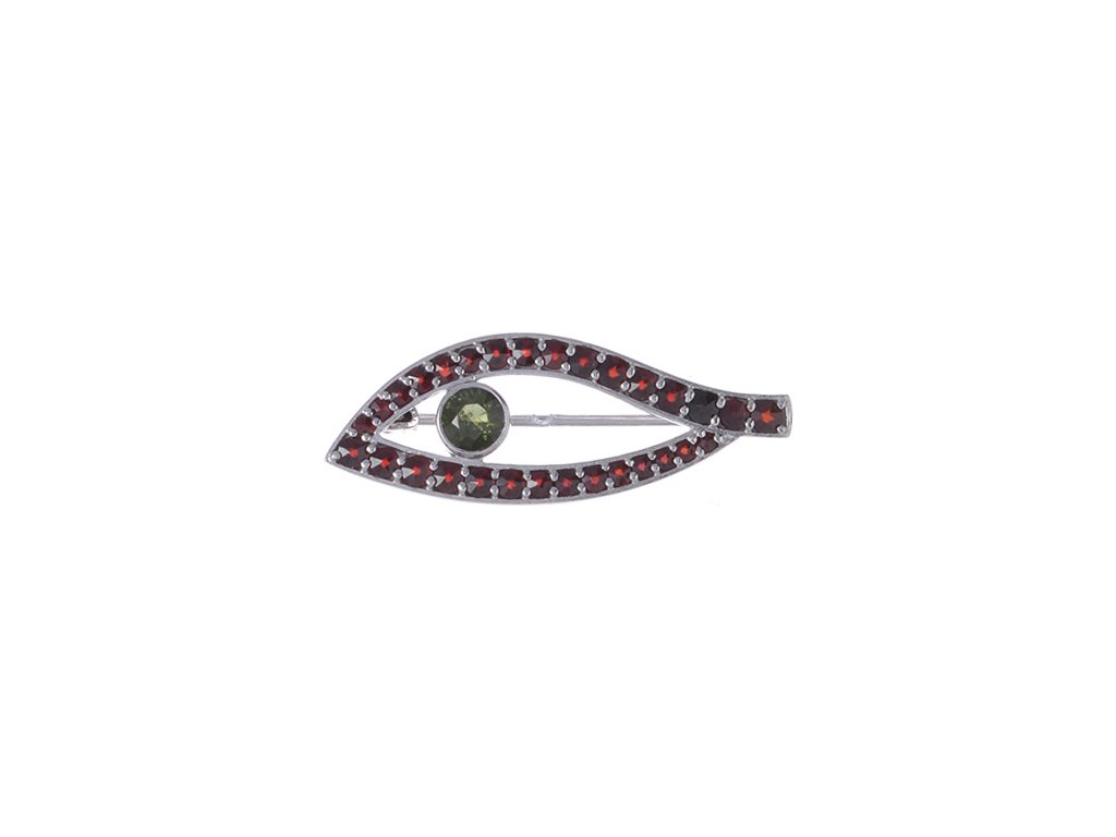 Silver brooch with czech garnet and moldavite, rhodium plated - wave
