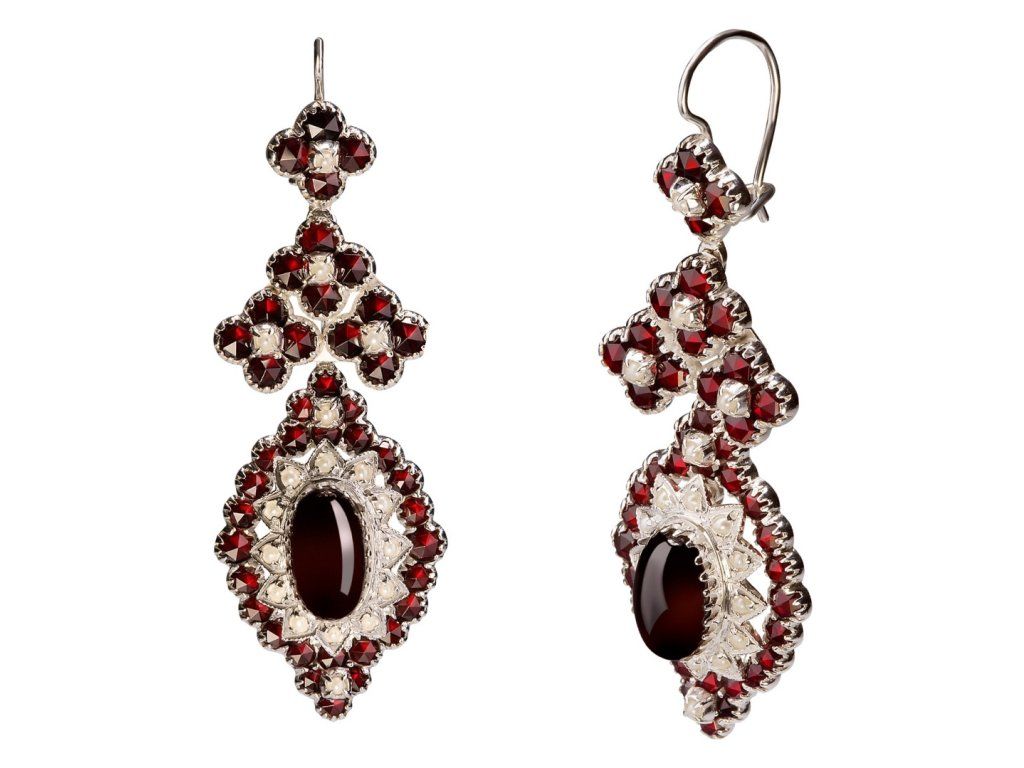 Tyto stylové náušnice jsou vyrobeny ze stříbra (Ag 925/1000) a zušlechtěny rhodiováním. Jsou zdobeny českým granátem, almandinem a perlou.