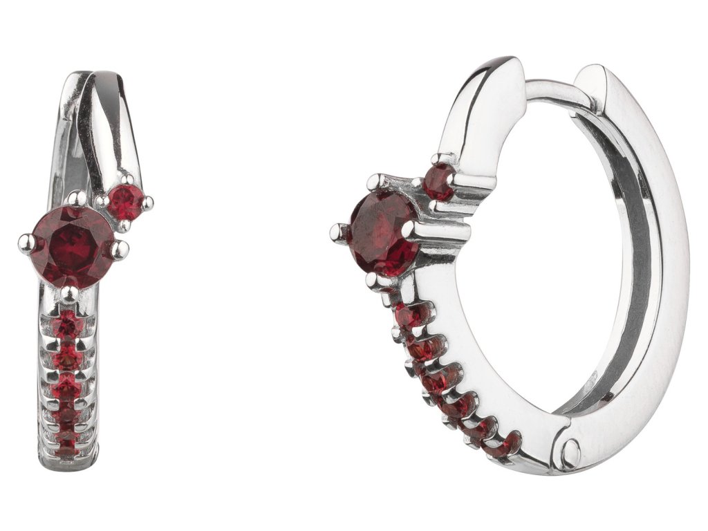 Tyto stylové náušnice jsou vyrobeny ze stříbra (Ag 925/1000) a zušlechtěny rhodiováním. Jsou zdobeny českým granátem. Náušnice mají tvar kruh o velikosti 18x18 mm.