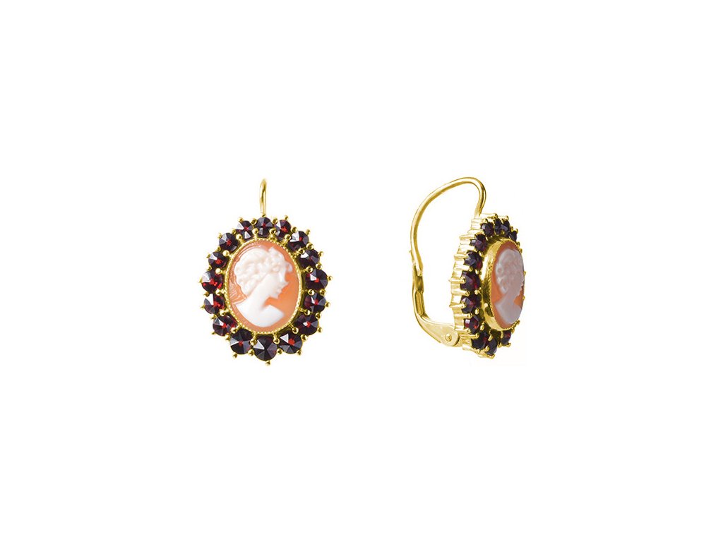 Silver earrings with czech garnet and cameo, gold plated - oval