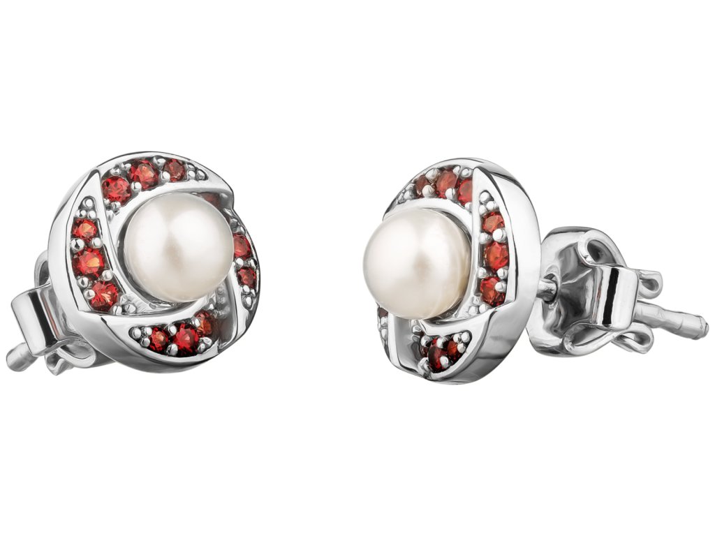 Silver earrings with czech garnet and pearl, rhodium plated - circle