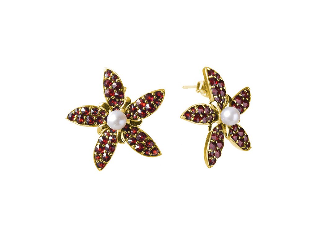 Silver earrings with czech garnet and pearl, gold plated - flower