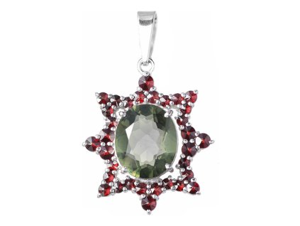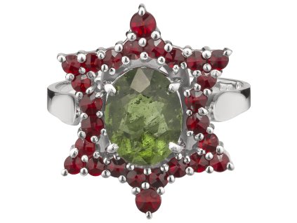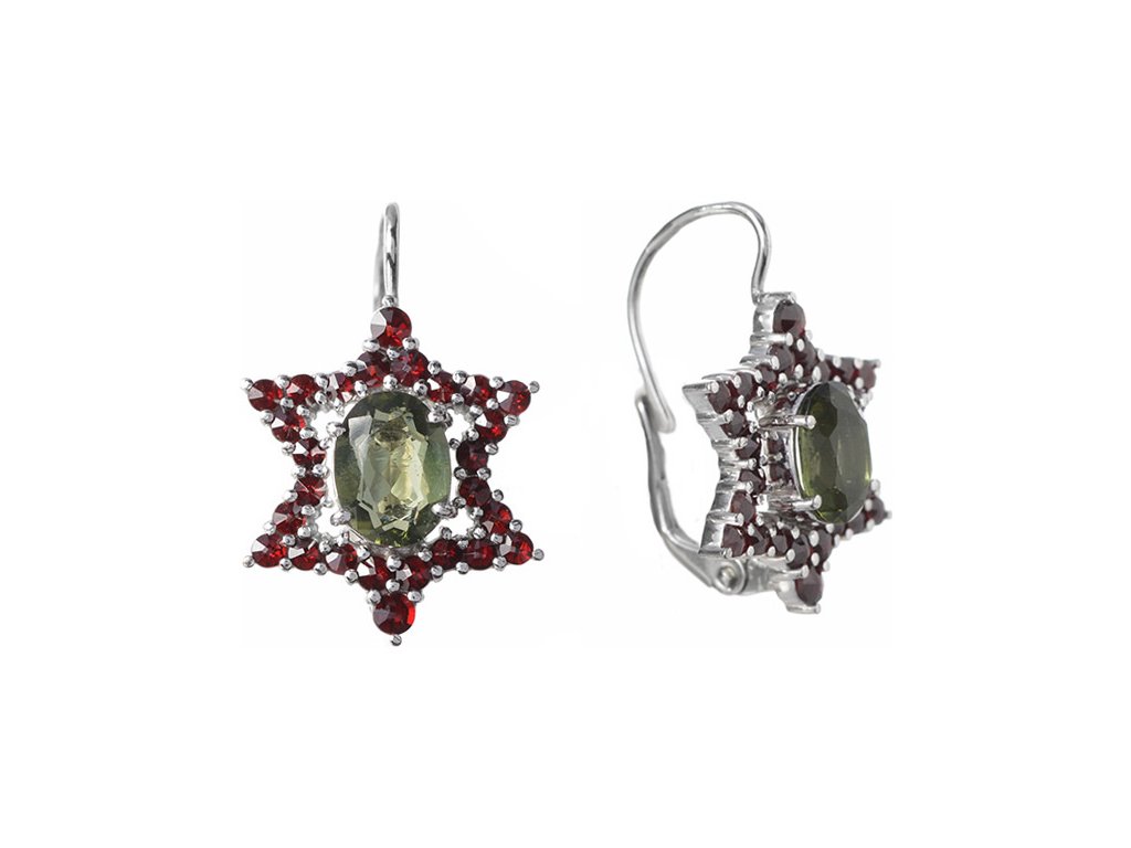Silver earrings with czech garnet and moldavite, rhodium plated - star