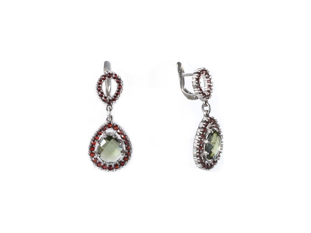 Silver earrings with czech garnet and moldavite, rhodium plated - drop