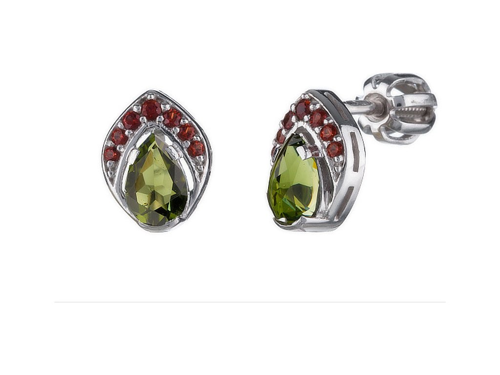Silver earrings with czech garnet and moldavite, rhodium plated - drop