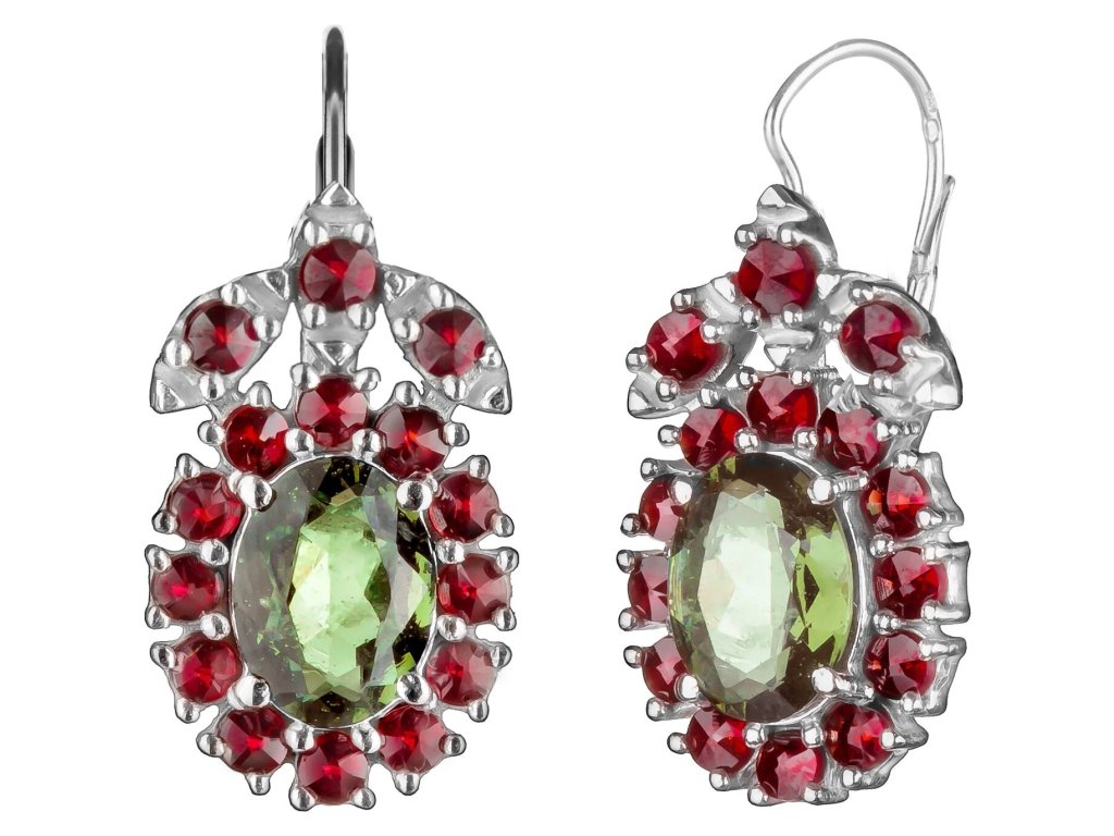 Silver earrings with czech garnet and moldavite, rhodium plated - oval