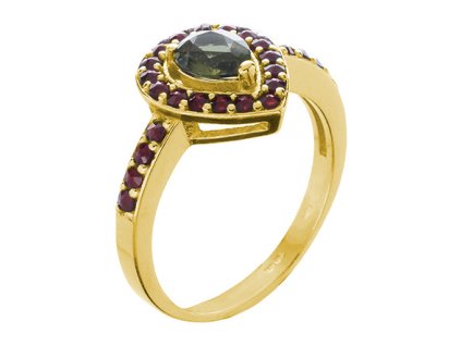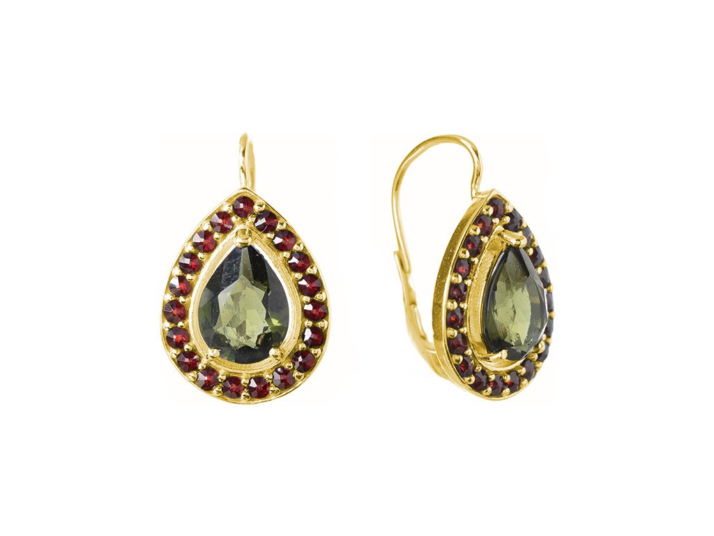Silver earrings with czech garnet and moldavite, gold plated - drop