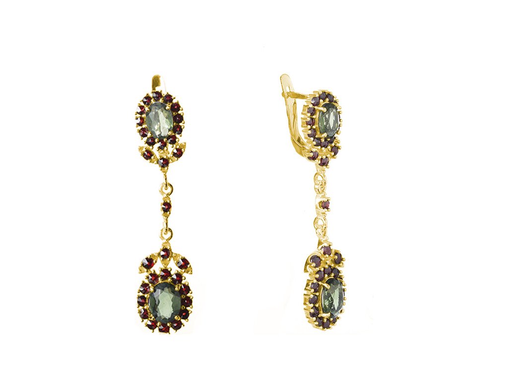 Silver earrings with czech garnet and moldavite, gold plated - oval
