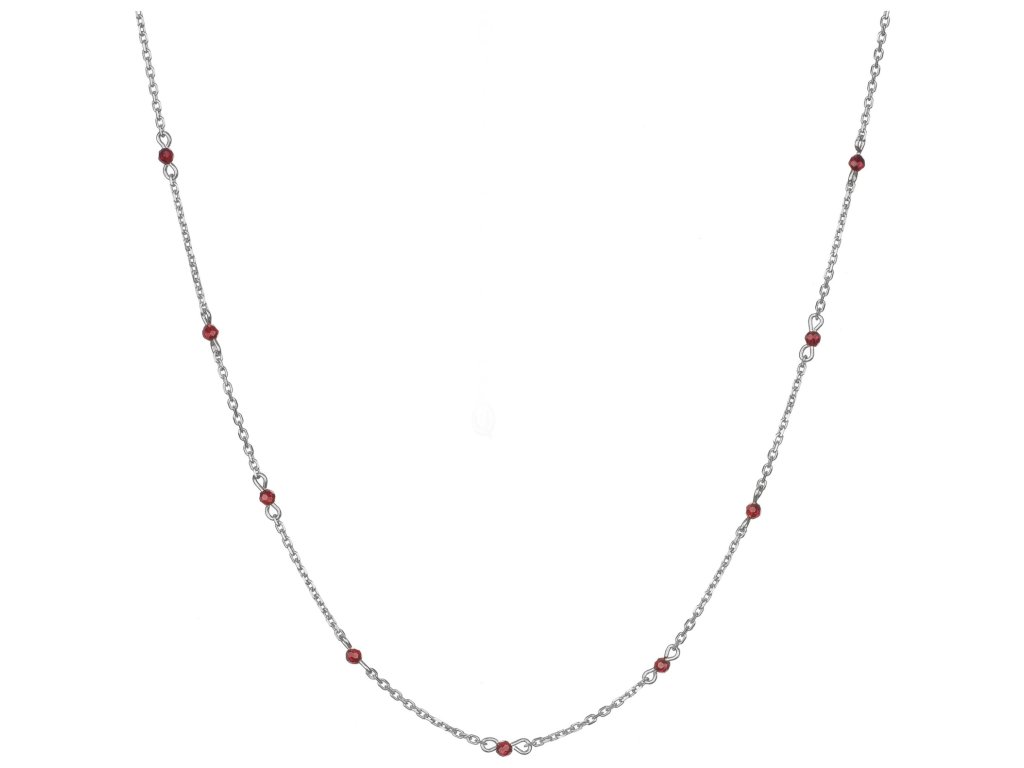 Tento elegantní náhrdelník je vyroben ze stříbra (Ag 925/1000) a zušlechtěn rhodiováním. Je zdoben českým granátem o velikosti 2,4 mm.
