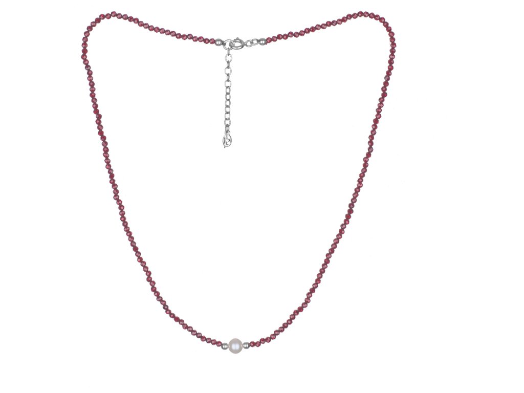 Tento elegantní náhrdelník je vyroben ze stříbra (Ag 925/1000) a zušlechtěn rhodiováním. Je zdoben českým granátem o velikosti 2,4 mm a perlou.