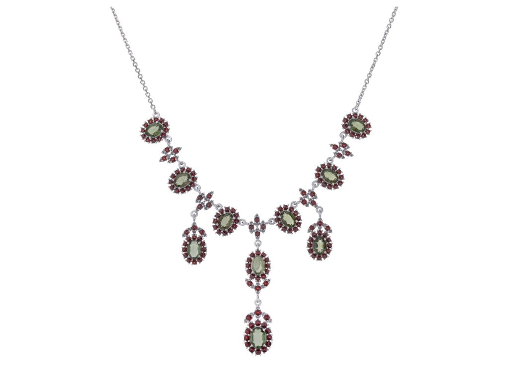 Silver necklace with czech garnet and moldavite, rhodium plated - oval