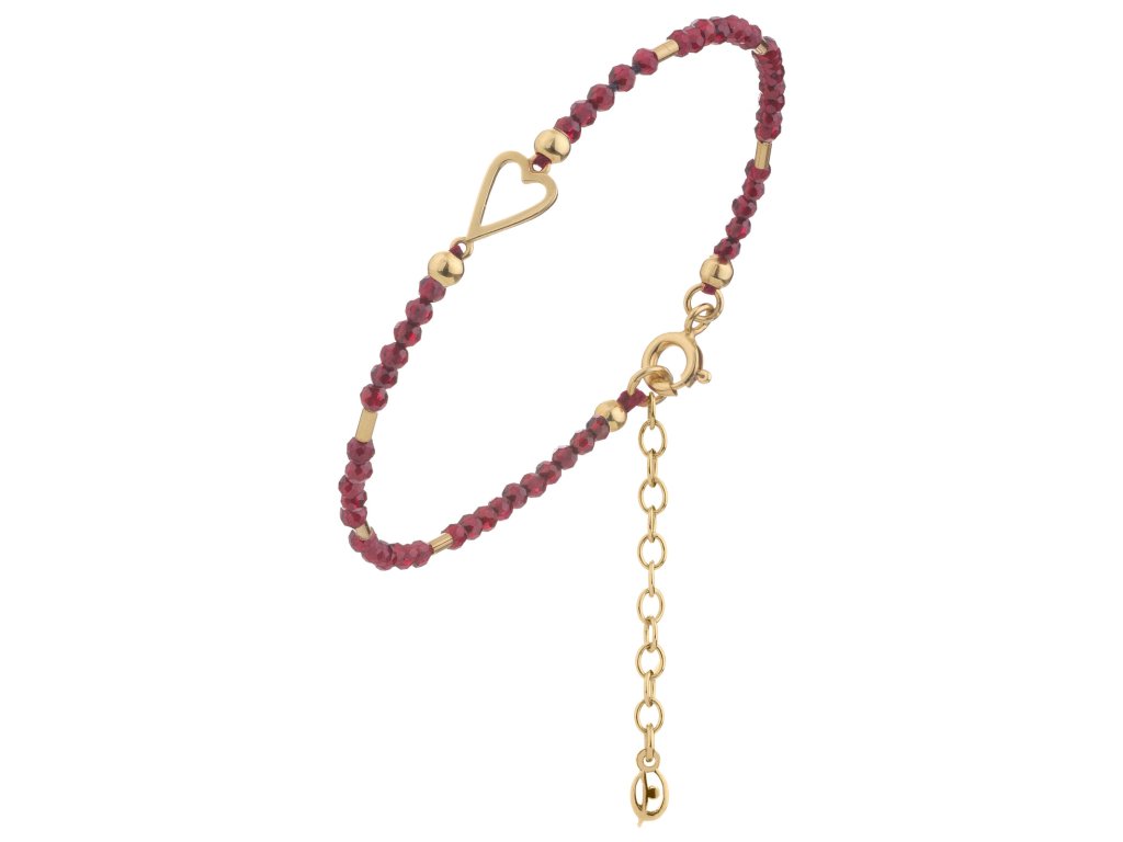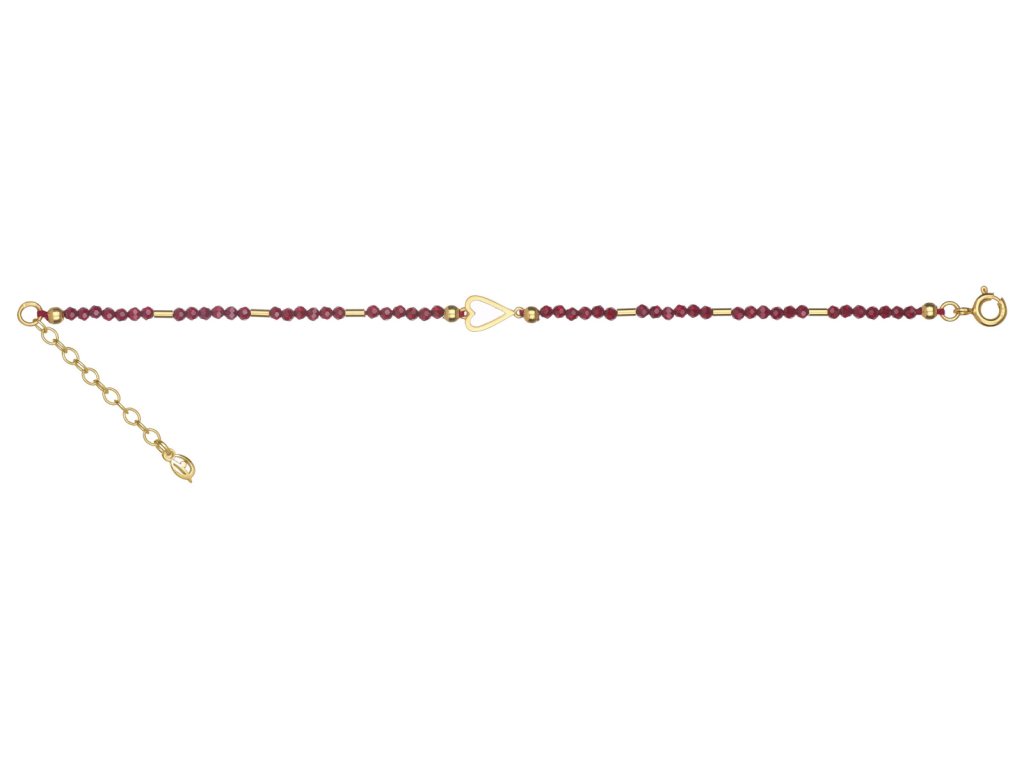 Tento elegantní náramek je vyroben ze stříbra (Ag 925/1000) a zušlechtěn zlacením. Je zdoben českým granátem o velikosti 2,4 mm, motiv srdce má rozměr 10x7 mm.