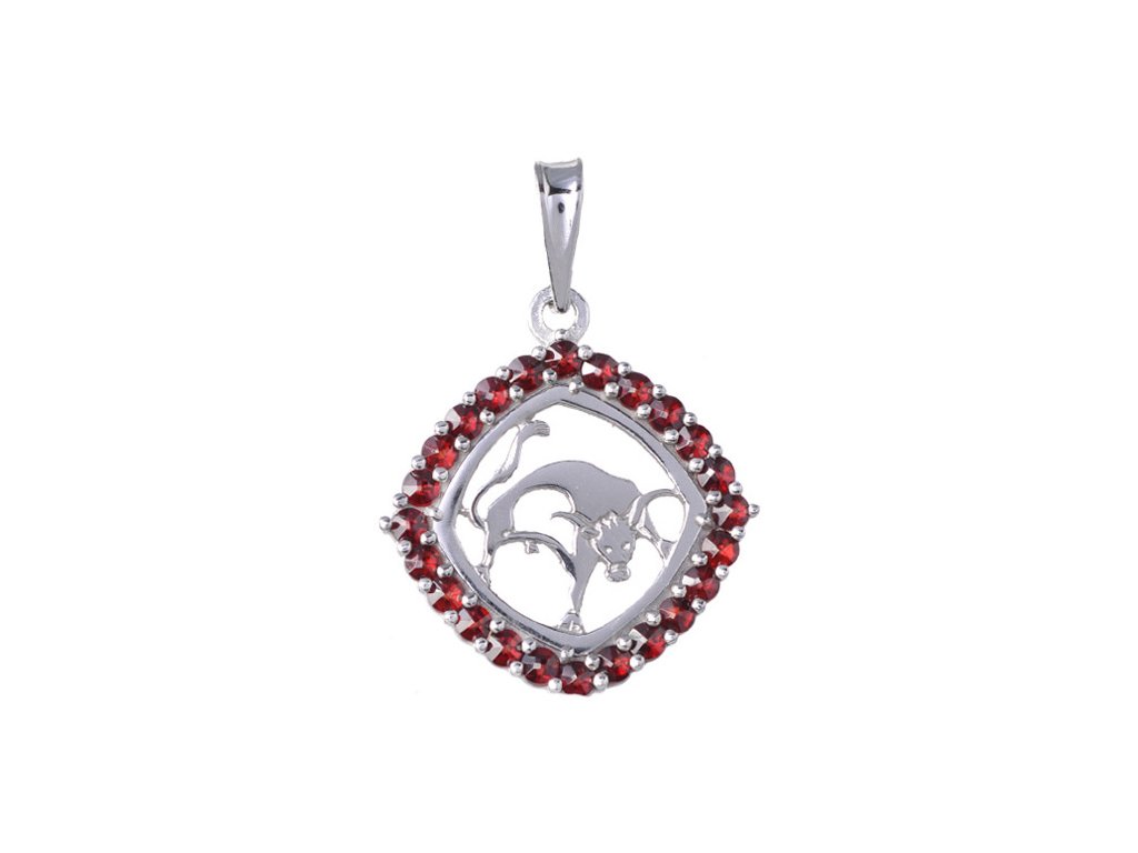 Silver pendant with czech garnet, rhodium plated, zodiac sign - bull