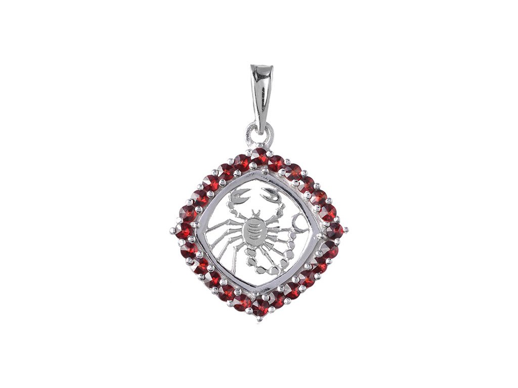 Silver pendant with czech garnet, rhodium plated, zodiac sign - scorpio