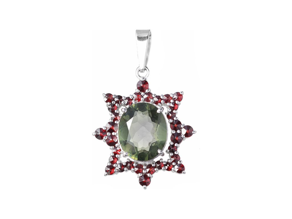 Silver pendant with czech garnet and moldavite, rhodium plated - star