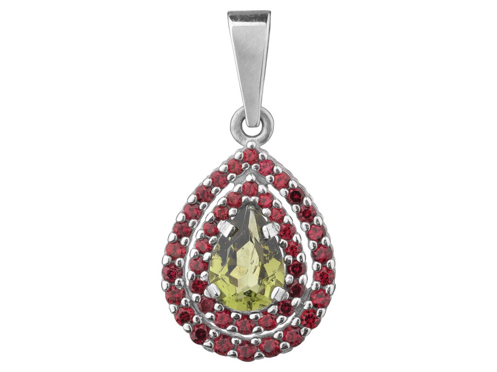 Tento stylový přívěsek je vyroben ze stříbra (Ag 925/1000) a zušlechtěn rhodiováním. Je zdoben českým granátem a vltavínem. Šperku dominuje středový vltavín. Přívěsek má motiv kapka o velikosti 15x11 mm.