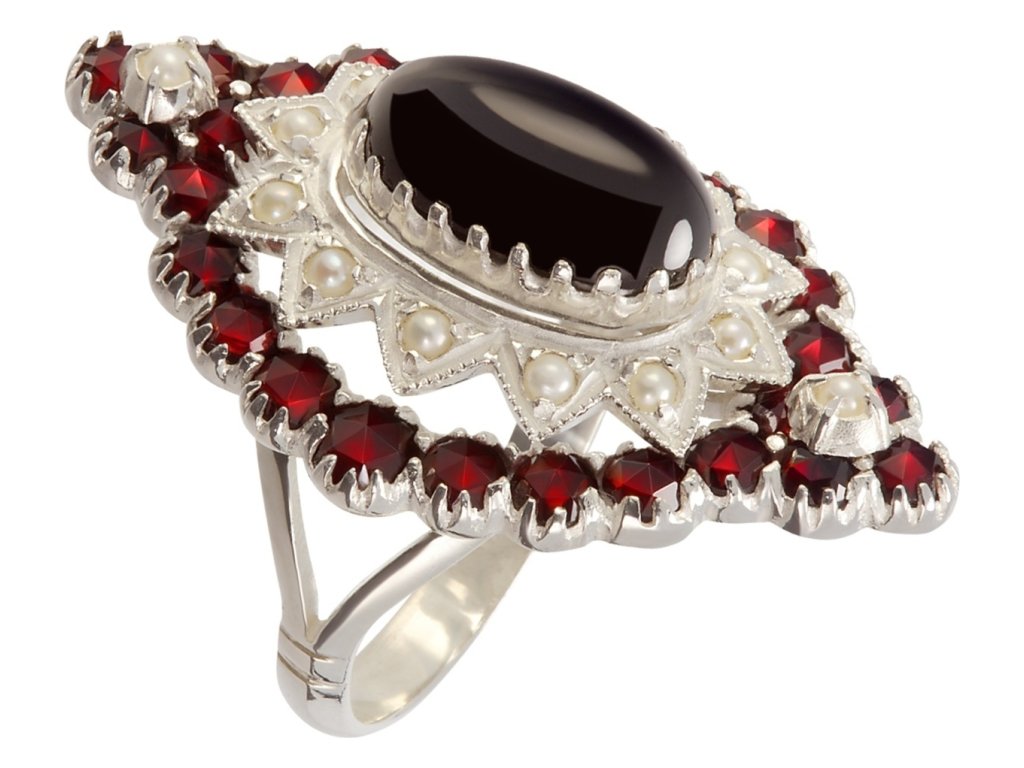 Tento stylový prsten je vyroben ze stříbra (Ag 925/1000) a zušlechtěn rhodiováním. Je zdoben českým granátem, almandinem a perlou. Šperku dominuje středový almandin. Velikost motivu je 32x20 mm.