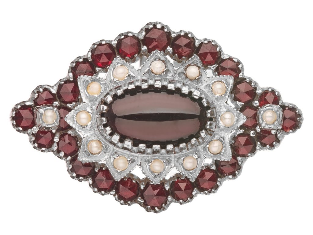 Stříbrný prsten s českým granátem a perlou, rhodiovaný