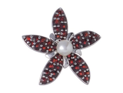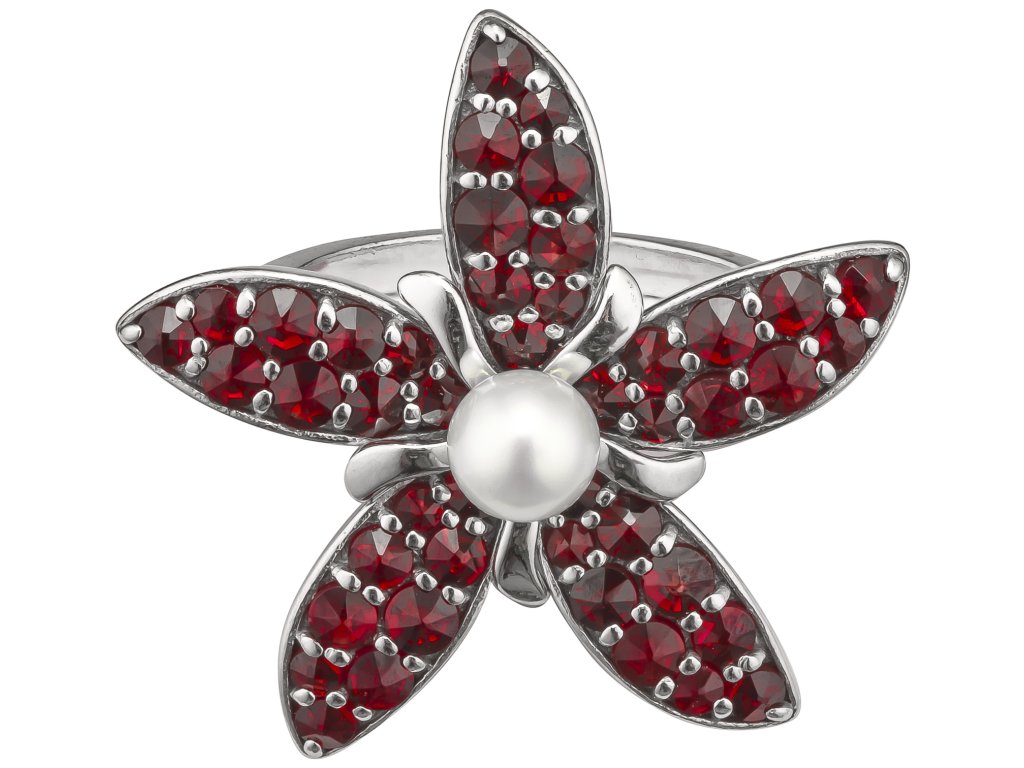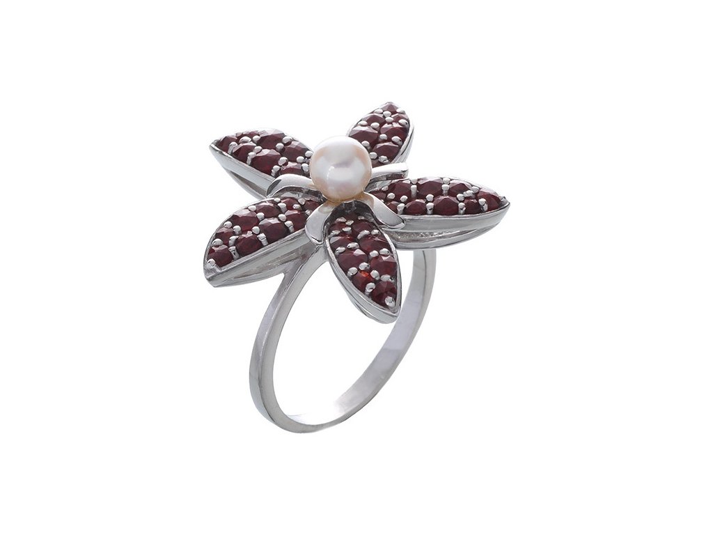 Silver ring with czech garnet and pearl, rhodium plated - flower