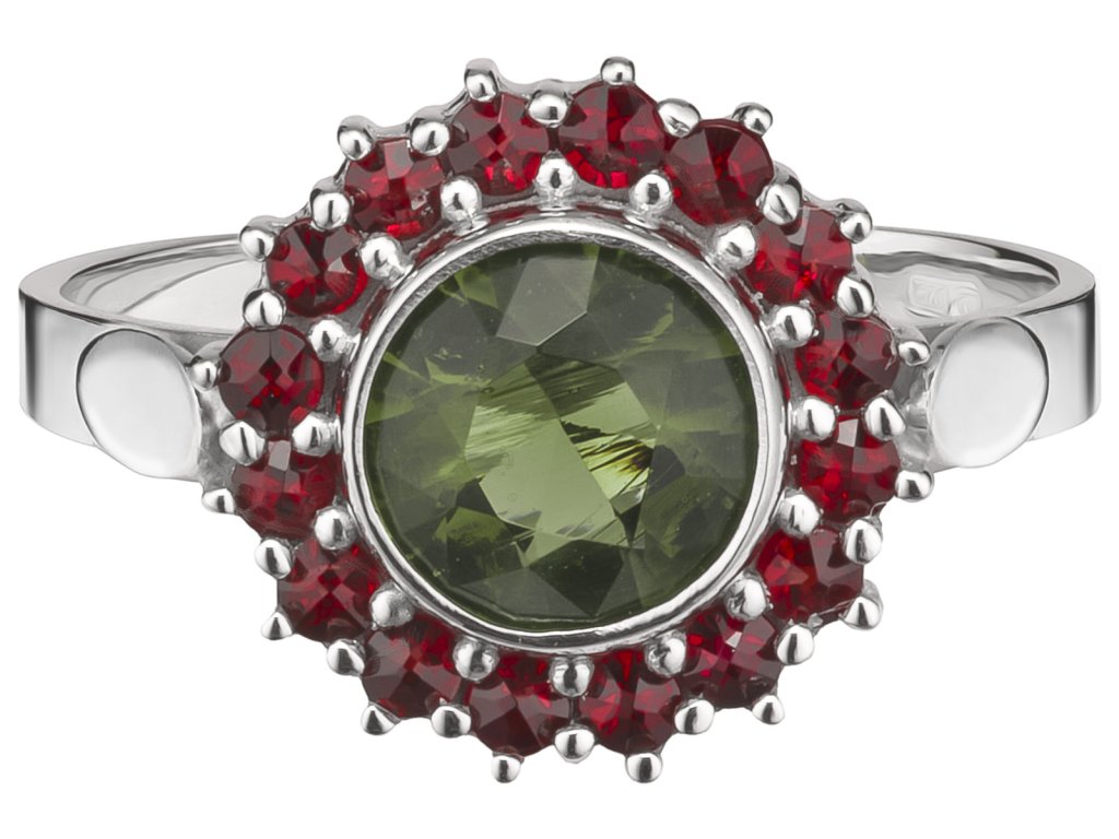Silver ring with czech garnet and moldavite, rhodium plated - flower
