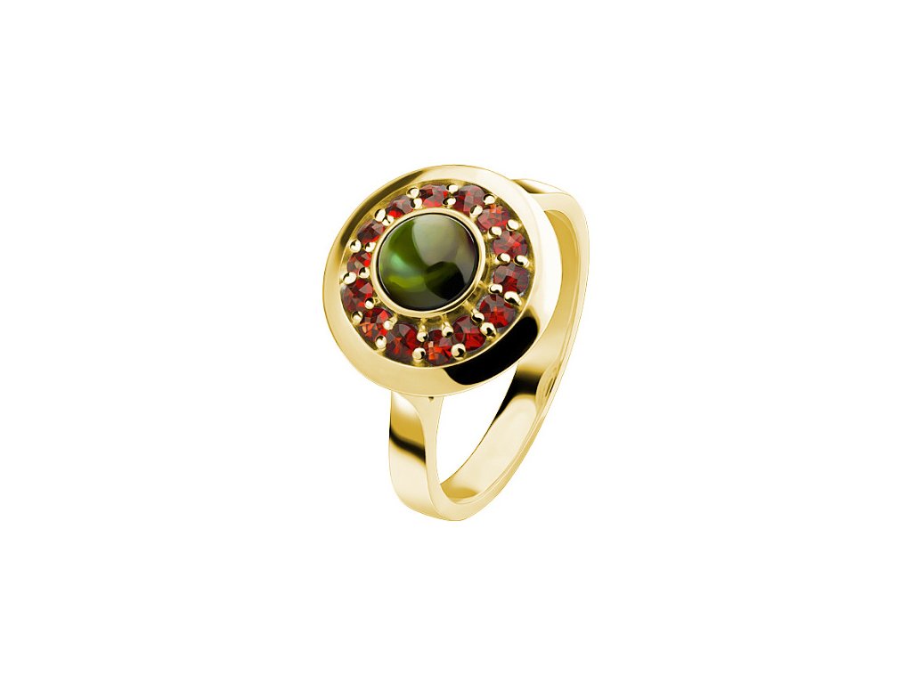 Silver ring with czech garnet and moldavite, gold plated - circle