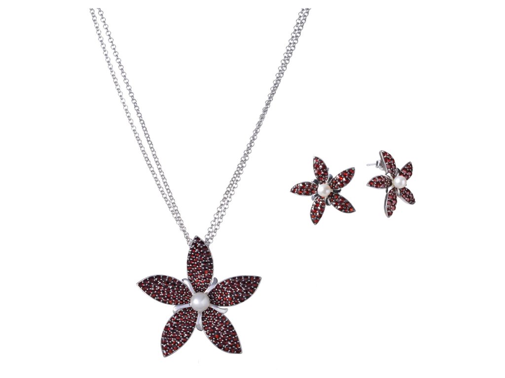 Set of silver jewellery 1178 with czech garnet and pearl, rhodium plated - flower