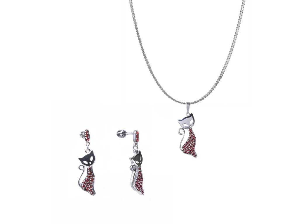 Set of silver jewellery 1246 with czech garnet, rhodium plated - animal - cat