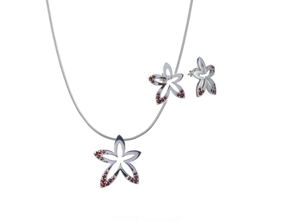 Set of silver jewellery 1253 with czech garnet, rhodium plated - flower