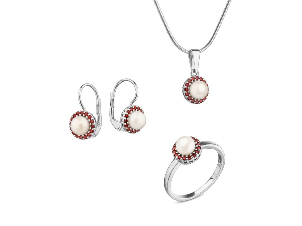 Set of silver jewellery 1465 with czech garnet and pearl, rhodium plated - circle