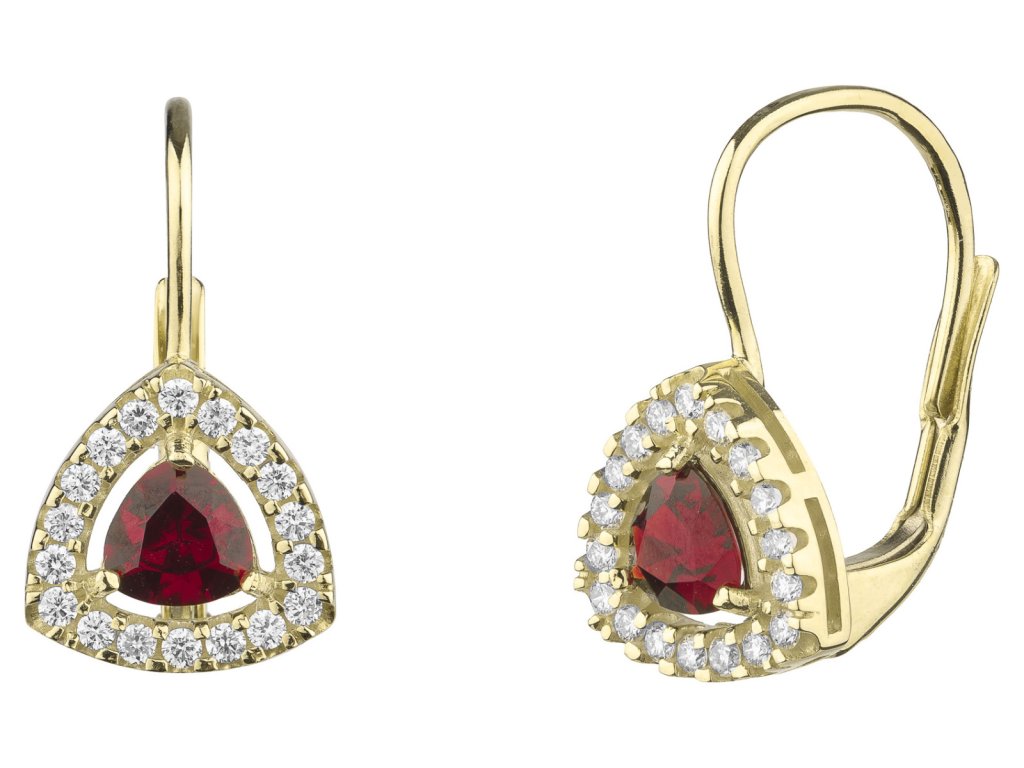 Zlaté náušnice s českým granátem a diamantem - trojúhelník