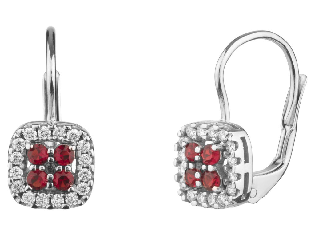 Tyto elegantní náušnice jsou vyrobeny z bílého zlata (Au 585/1000) a zušlechtěny rhodiováním. Jsou zdobeny českým granátem a diamantem. Náušnice mají motiv čtverec o velikosti 8x8 mm.