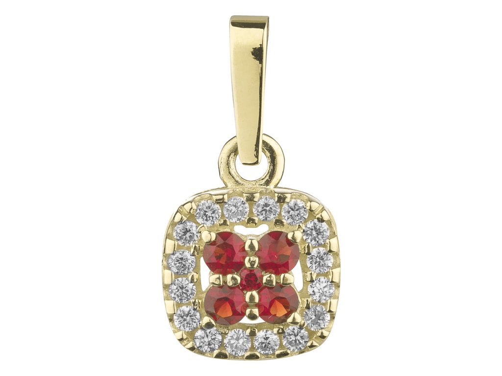 Tento stylový přívěsek je vyroben ze zlata (Au 585/1000). Je zdoben českým granátem a diamantem. Přívěsek má tvar čtverec o velikosti 8x8 mm.
