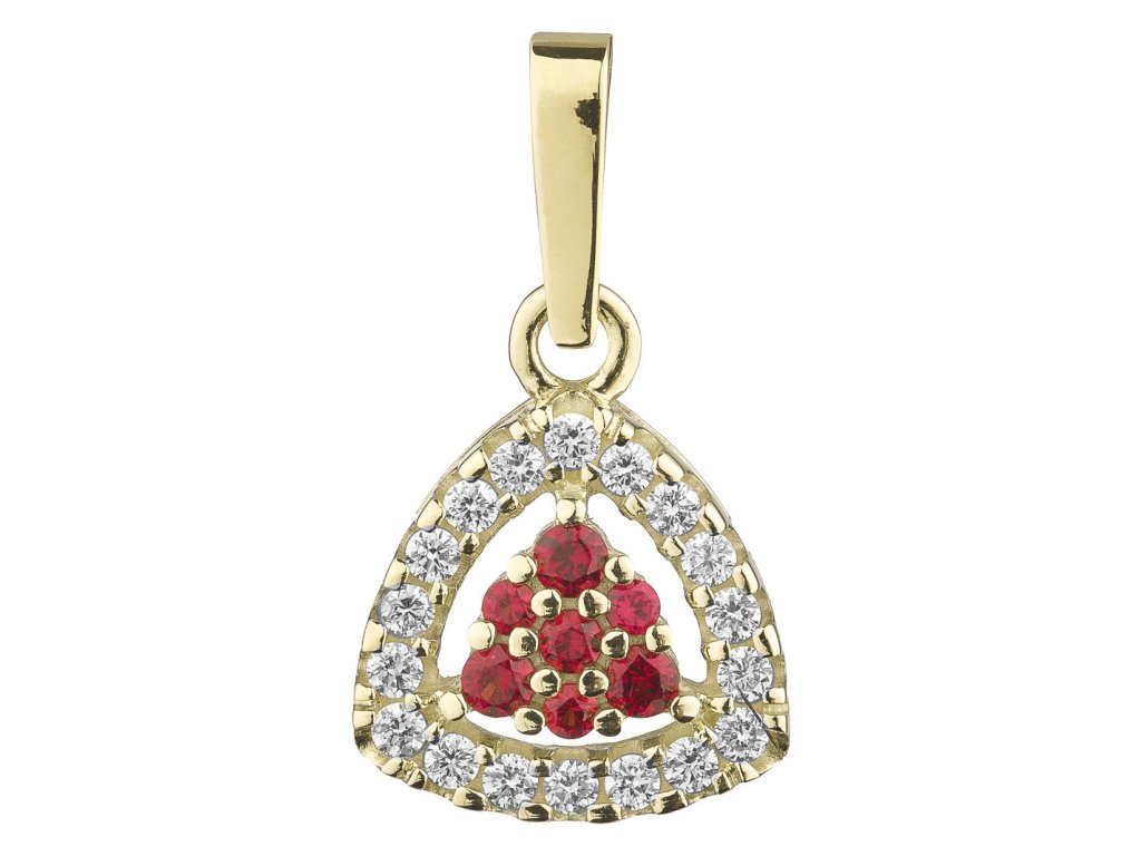 Tento elegantní přívěsek je vyroben ze zlata (Au 585/1000). Je zdoben českým granátem a diamantem. Přívěsek má tvar trojúhelník o velikosti 9x9 mm.