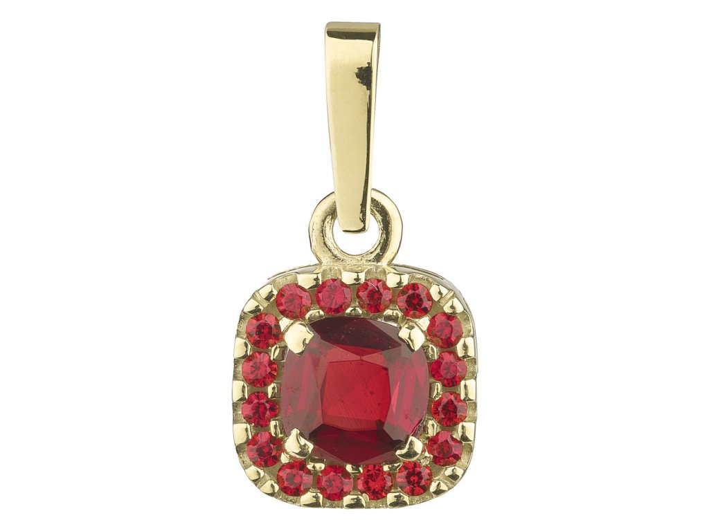 Tento stylový přívěsek je vyroben ze zlata (Au 585/1000). Je zdoben českým granátem. Přívěsek má tvar čtverec o velikosti 8x8 mm.