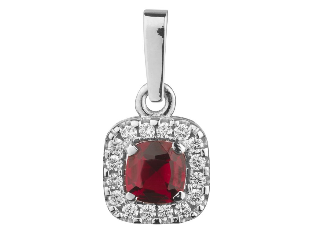Tento elegantní přívěsek je vyroben ze zlata (Au 585/1000) a zušlechtěn rhodiováním. Je zdoben českým granátem a diamantem. Šperku dominuje středový český granát. Přívěsek má tvar čtverec o velikosti 8x8 mm.
