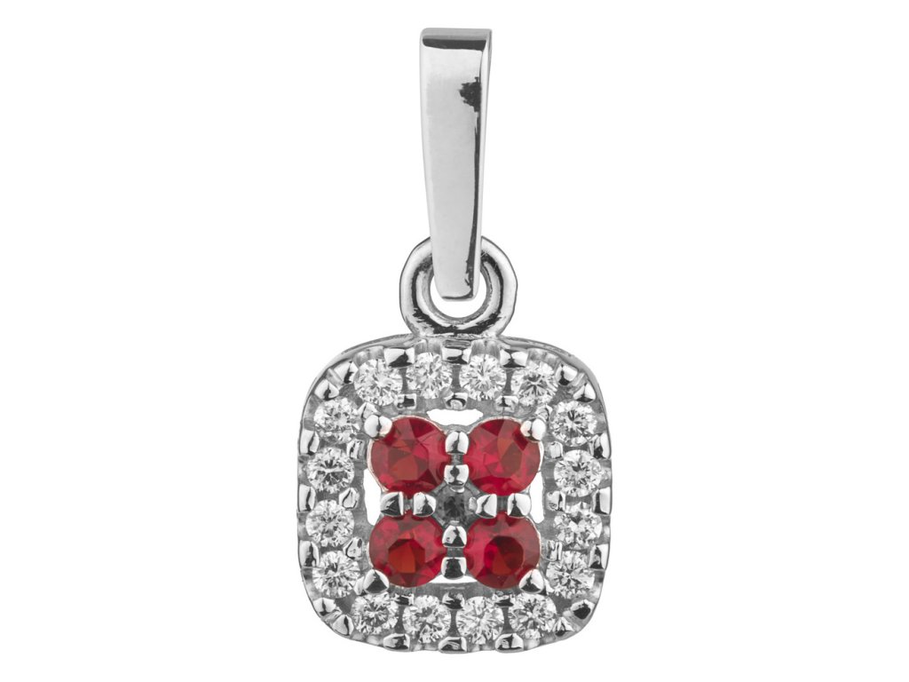 Tento stylový přívěsek je vyroben z bílého zlata (Au 585/1000) a zušlechtěn rhodiováním. Je zdoben českým granátem a diamantem. Přívěsek má tvar čtverec o velikosti 8x8 mm.