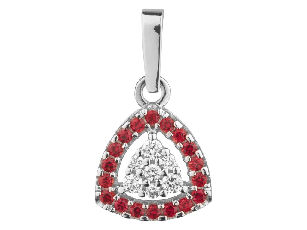 Tento elegantní prsten je vyroben ze zlata (Au 585/1000) a zušlechtěn rhodiováním. Je zdoben českým granátem a diamantem. Přívěsek má tvar trojúhelník o velikosti 9x9 mm.