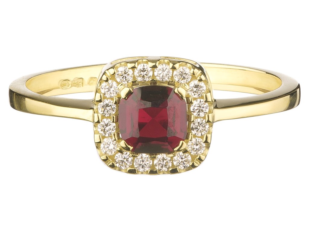 Zlatý prsten s českým granátem a diamantem - čtverec