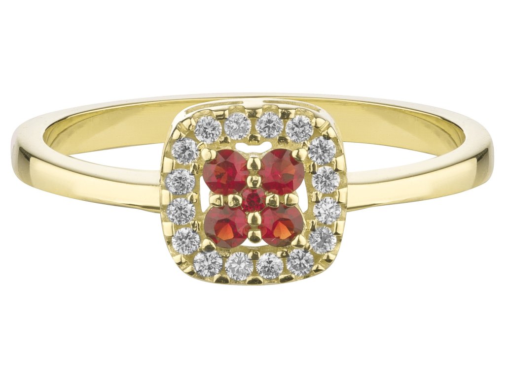 Tento elegantní prsten je vyroben ze zlata (Au 585/1000). Je zdoben českým granátem a diamantem.Prsten má tvar čtverec o velikosti 8x8 mm.
