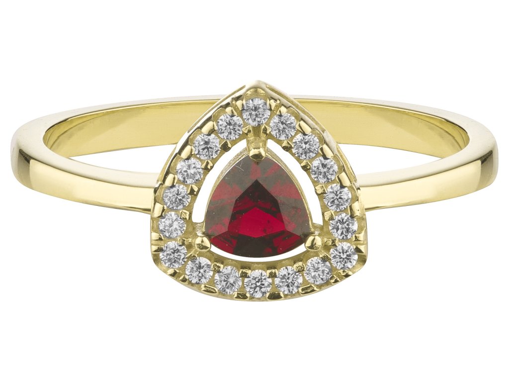 Tento stylový prsten je vyroben ze zlata (Au 585/1000). Je zdoben českým granátem a diamantem. Šperku dominuje středový český granát. Prsten má tvar trojúhelník o velikosti 10x10 mm.