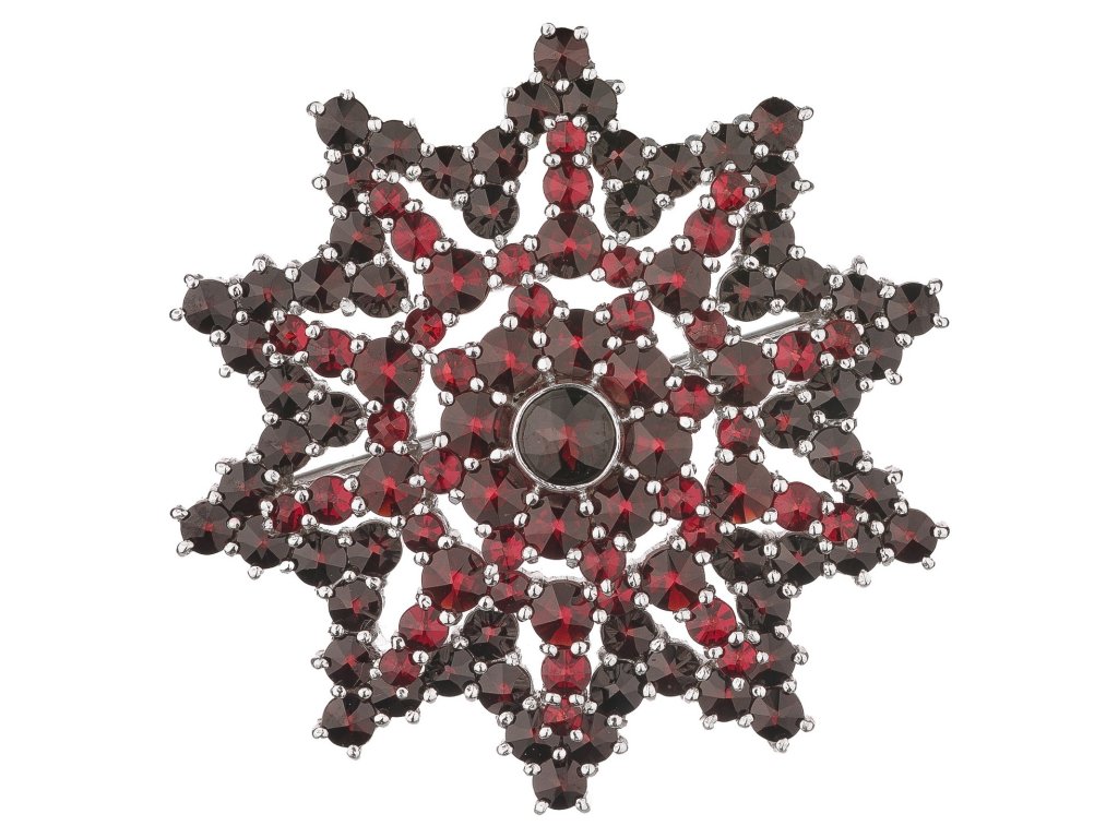 Tato stylová brož je vyrobena ze stříbra (Ag 925/1000) a zušlechtěna rhodiováním. Je zdobena českým granátem a almandinem. Brož má motiv hvězda o velikosti 37x37 mm.