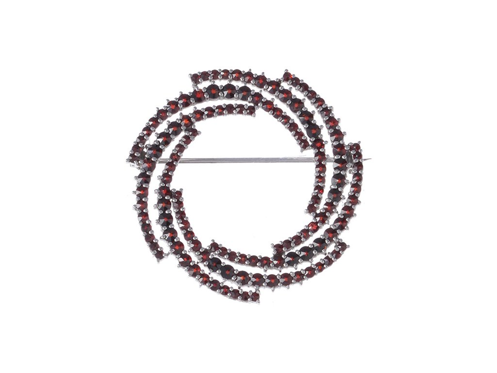 Stříbrná brož s českým granátem, rhodiovaná - kruh