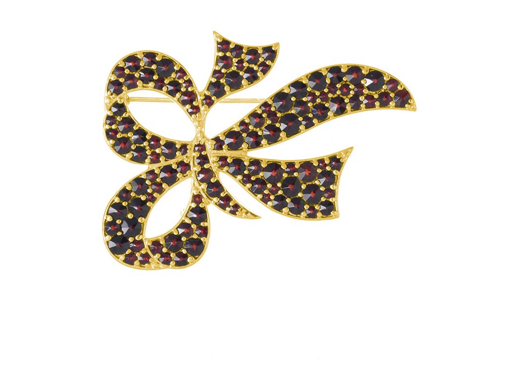 Tato stylová brož je vyrobena ze stříbra (Ag 925/1000) a zušlechtěna zlacením. Je zdobena českým granátem a almandinem. Brož má motiv mašle o velikosti 57x36 mm.