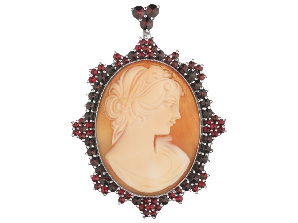 Tato stylová brož - závěs je vyrobena ze stříbra (Ag 925/1000) a zušlechtěna rhodiováním. Je zdobena českým granátem a almandinem a kamejí. Šperku dominuje středová kamej. Brož - závěs má tvar ovál