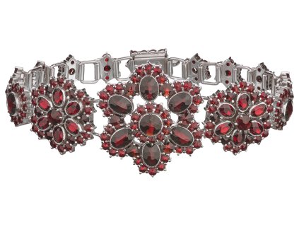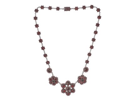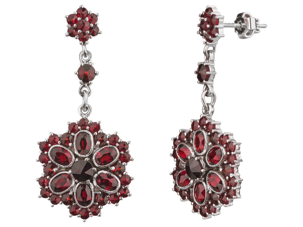 Tyto stylové náušnice jsou vyrobeny ze stříbra (Ag 925/1000) a zušlechtěny rhodiováním. Jsou zdobeny českým granátem a almandinem. Velikost největšího dílku je 20x20 mm.