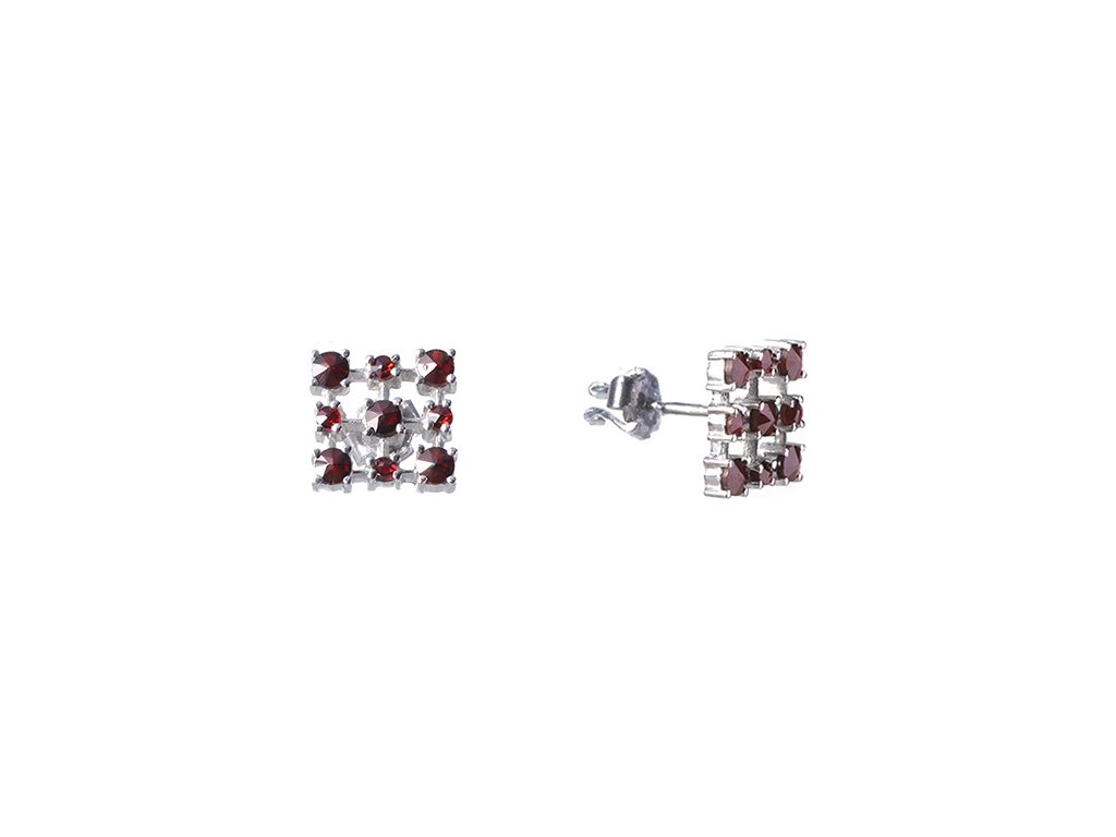 Silver earrings with czech garnet, rhodium plated - square